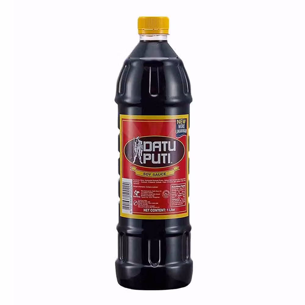 Vatten, hydrolyserat, SOJABÖNPROETIN, jodsalt, karamell färg, smakförstärkare: E261, surhetsreglerande medel: E330, konserveringsmedel: E202, smakförstärkare: E631, E627, färgämne: E102, E129.